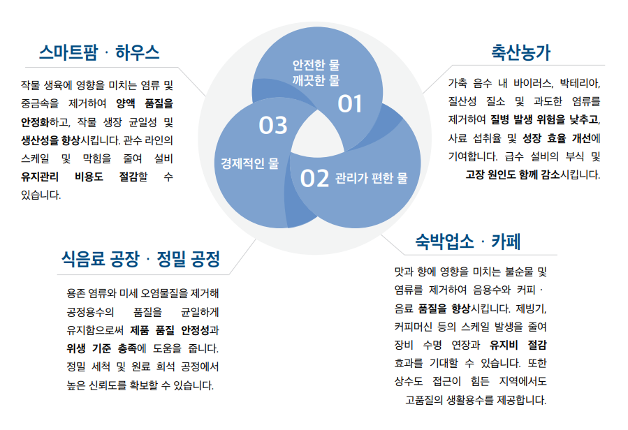 수자원공사에서 정수하여 각 가정으로 배분하는 상수도와는 달리, 지하수 내엔 다양한 물질이 포함될 수 있습니다. 이 물질들은 일정 농도 이상이 되면 생물에 악영향을 끼치거나, 장비나 부품의 고장을 발생 시키거나, 일상 생활에 불편을 줄 수 있습니다